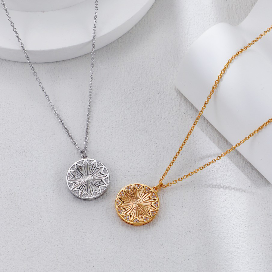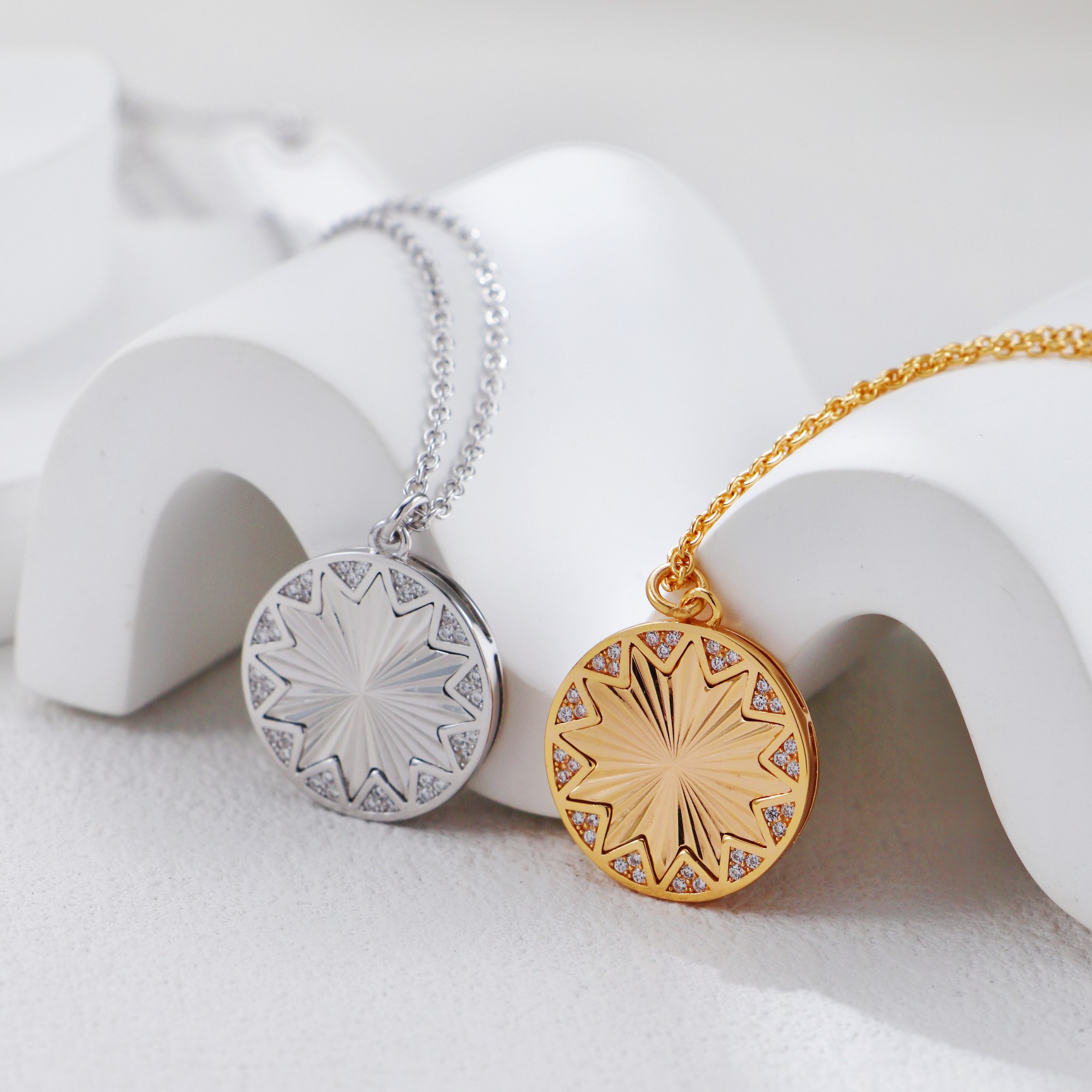 Celebrate the harmony of contrast with this elegant double-sided pendant necklace, available in both silver and gold finishes.