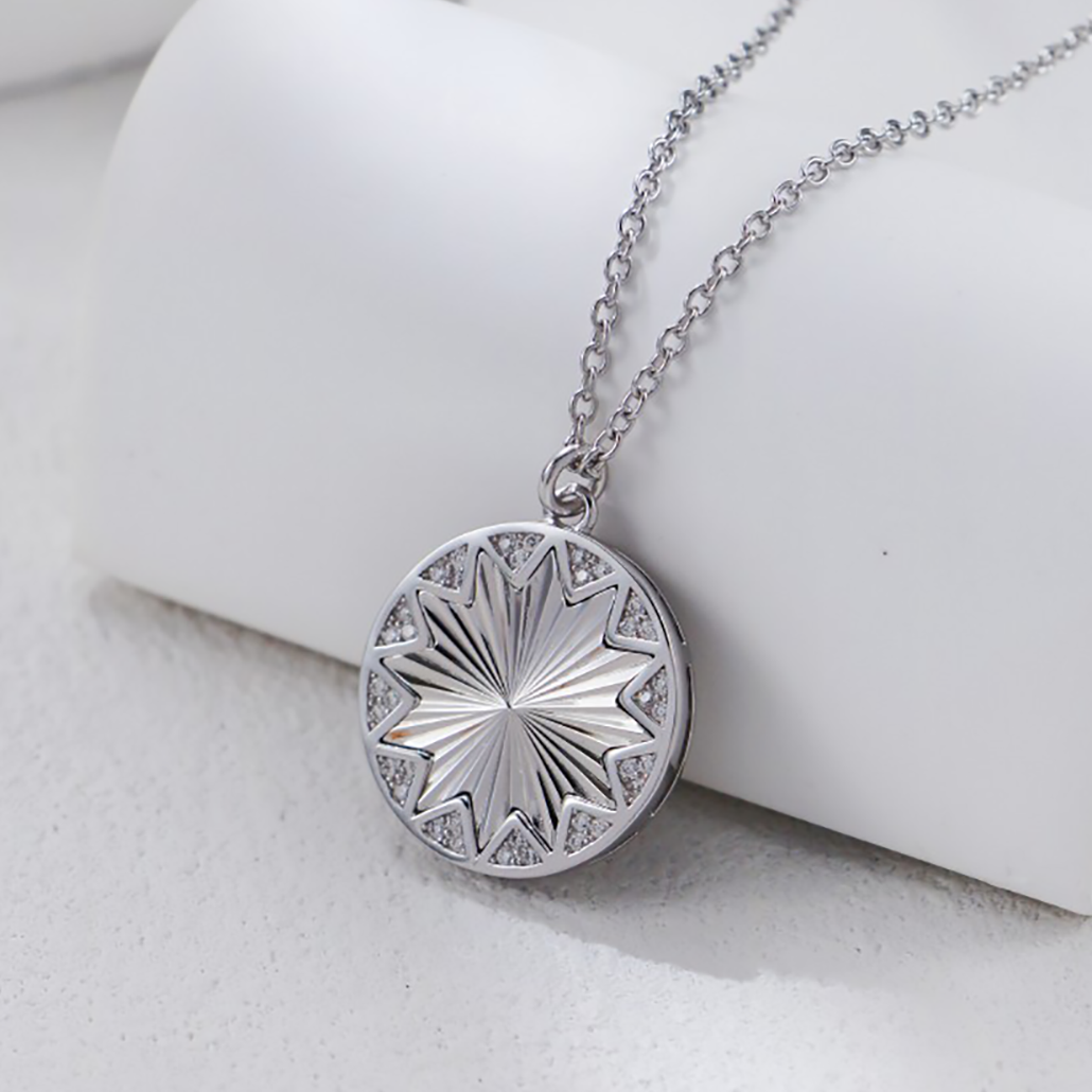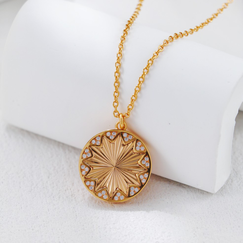One side features a radiant starburst design adorned with sparkling zircon stones, while the reverse reveals an intricate mandala-style flower—two timeless symbols of light and beauty in one graceful piece.